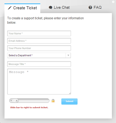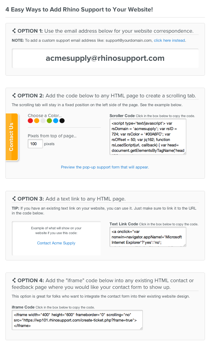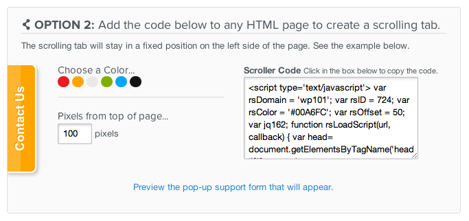Add scrolling tabs, text links or ticket forms to any site with convenient copy/paste options.