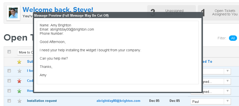 Are there tickets that need to be escalated? The star icon next to each ticket can change colors.