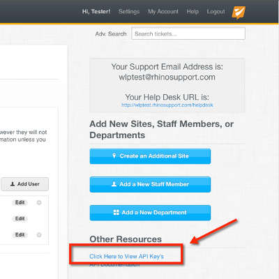 2. In your new Rhino Support account click on 'Settings' and then 'Click Here to View API Key's' as shown in the images below: